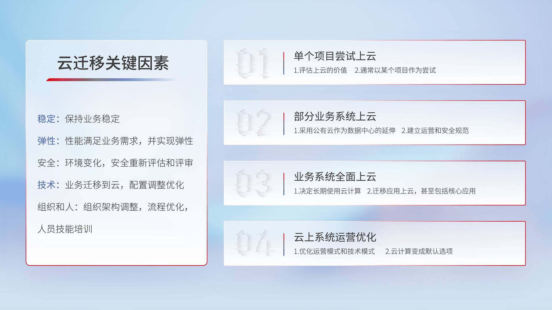 结合实际业务,,从规划设计、、、云平台选型、、、、云原生改造、、、、数据迁移、、、集成交付,,,迁移全过程为客户识别最佳上云路径,,,做好风险识别管理,,,,设计网络架构、、、身份权限、、、、安全审计合规、、操作审计、、、日志审计、、、监控告警策略、、多站点容灾设计等,,,,对云上基础设施进行整体规划,,,,提升IT治理水平,,以满足弹性、、高可用、、、、高性能的需求。。。。