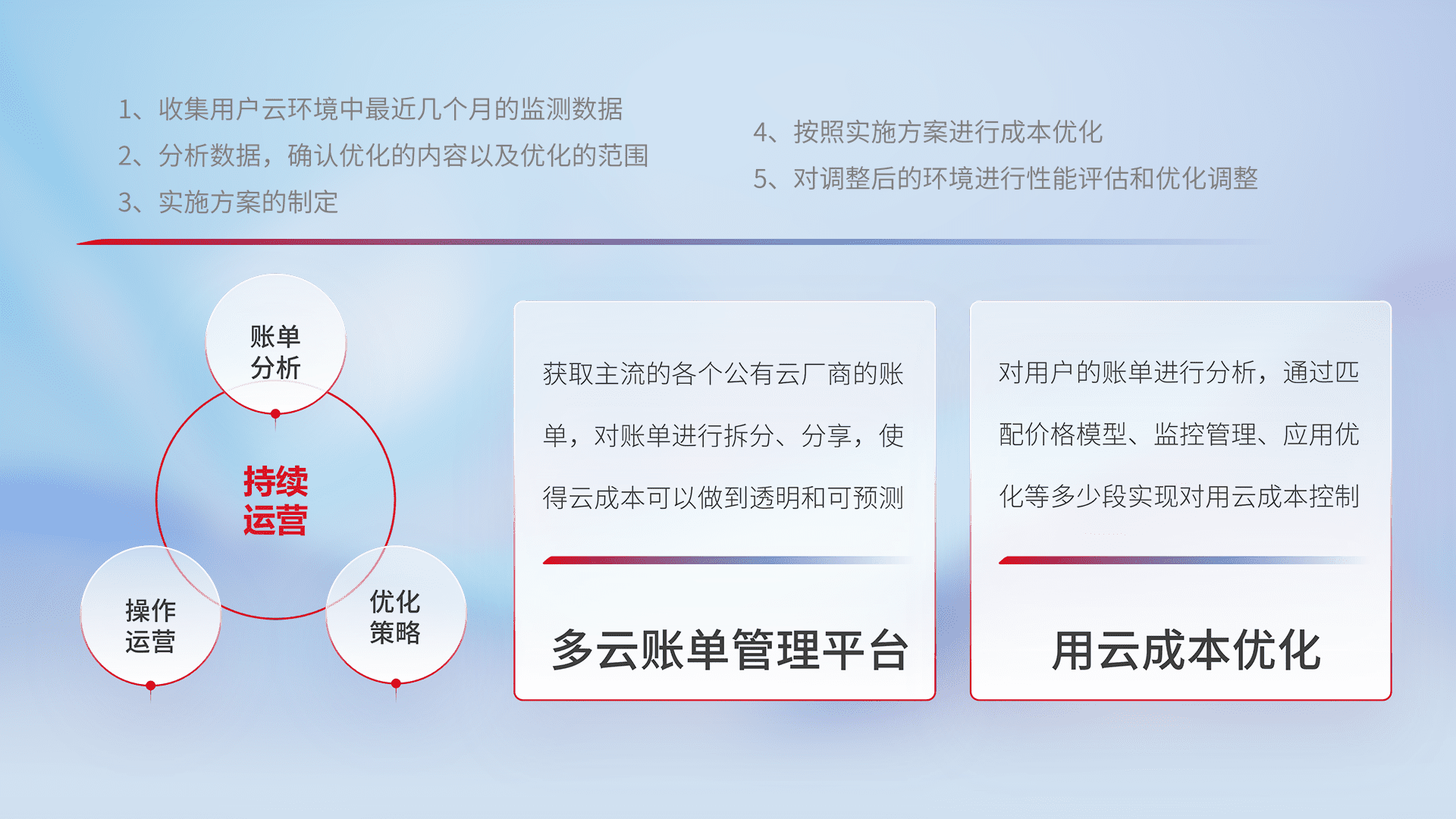 通过多云纳管,,以统一的资源数据模型把客户的云资源进行抽象和封装,,进而实现对多云资源的统一操作,,保障云资源管理的可靠性、、稳定性与可用性。。。量身定制化运维内容,,,配置、、、、开发运维、、补丁管理、、备份、、、、监控、、认证和访问管理、、、审计和日常巡检等,,保障在用云过程中的可靠度,,,,稳定度以及高可用率。。